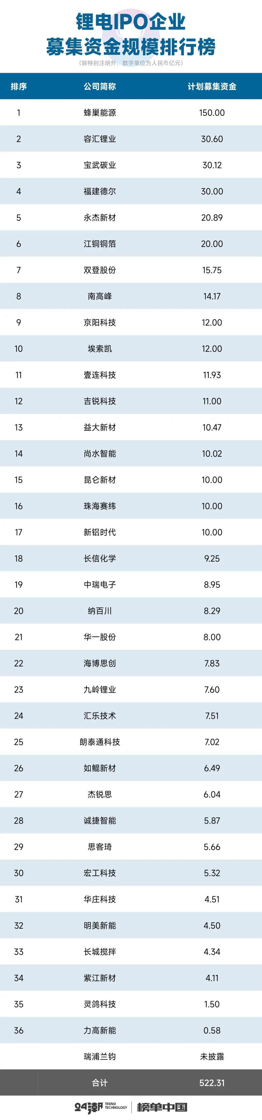 此外,头部企业进击势头也更加凶猛:据24潮统计,37家企业计划募集资金超500亿元,募投项目总投资预算合计超900亿元(不含 “补充流动资金” ),其中,蜂巢能源和瑞浦兰钧募投项目总投资预算均超百亿元,两者合计达536.71亿元。