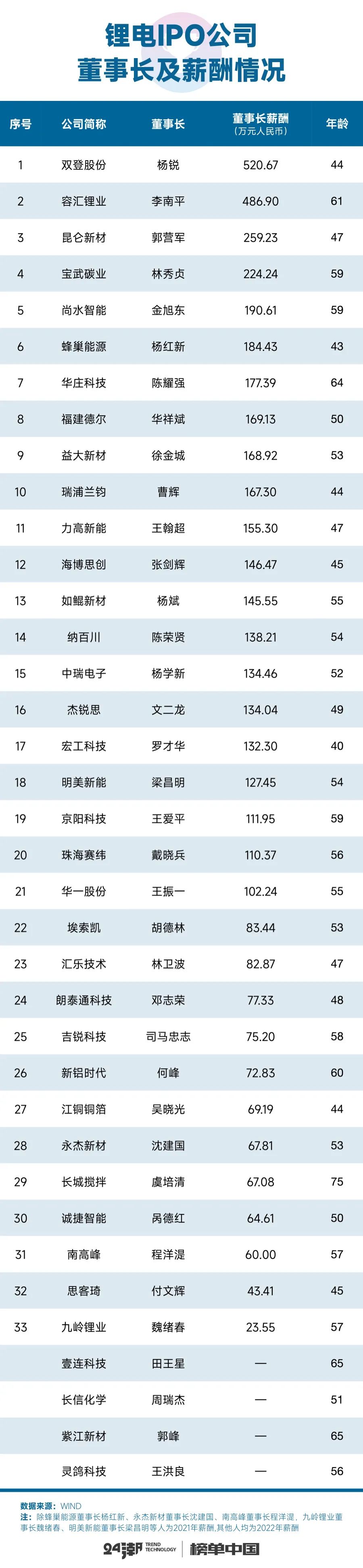 企业掌舵者的薪酬也有云壤之别,年薪酬最高的是双登股份董事长杨锐,2022年薪酬为520.67万元,是最后一位的22.11倍。