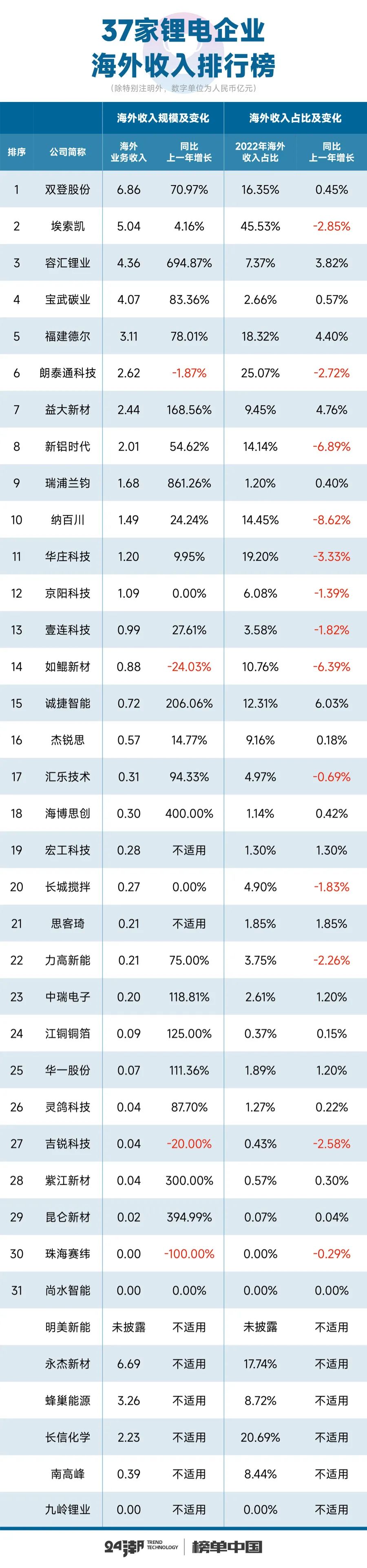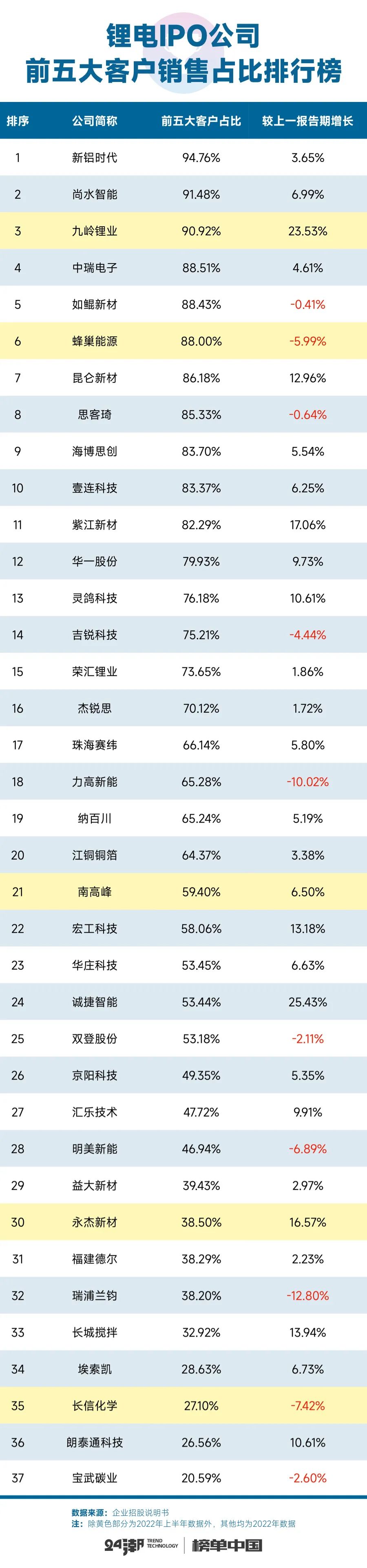 为使读者能更为直接、客观地了解这些拟IPO公司的综合实力,24潮团队统计了37家企业的营收与净利润、海外收入、总负债与资产负债率、资金净值、投资布局、董事长与薪酬等核心数据,发现了很多有趣的现象或趋势:比如在整体营收规模高速增长的同时,很多企业也隐现依赖大客户现象及风险,以及海外收入占比过低等问题。据24潮团队研究,2022年,这37家锂电企业总营收合计超900亿元,约同比增长超90%;但其中有25家企业前五大客户销售占比超50%,11家企业前五大客户销售占比超80%;37家企业2022年全年海外收入约为54亿元,占比仅为6%;