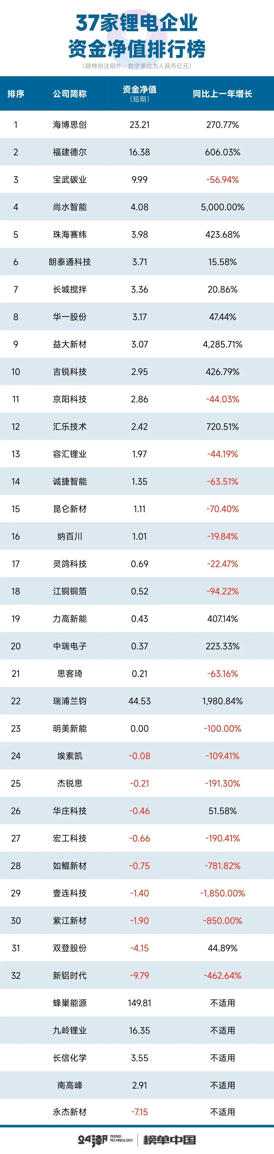 此外,多达58家锂电企业资金净值为负,即企业拥有的资金储备不足以覆盖长短期有息债务,其中8家企业资金缺口在100亿元以上。企业间资本实力差距极为明显。