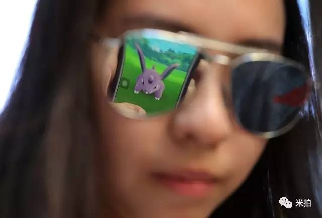 2016年7月25日,香港,一名《宠物小精灵》手游爱好者在玩这款手游,手机屏幕反射在她的太阳境上。