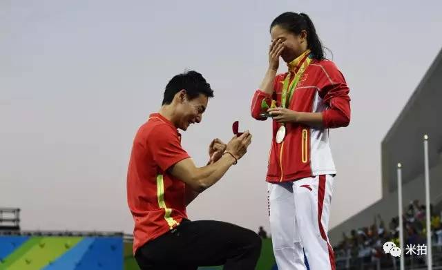 2016年8月14日,巴西里约热内卢,里约热内卢奥运会银牌获得者、中国女子三米板跑水选手何姿在领奖台上获得其男友的求婚。