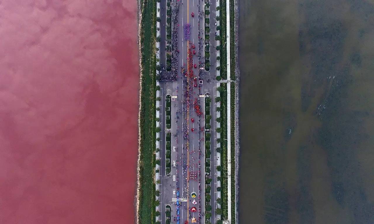 2016年9月25日,中国山西省运城,被一条公路分开的一个盐水湖因水藻的影响呈现两种不同的颜色。