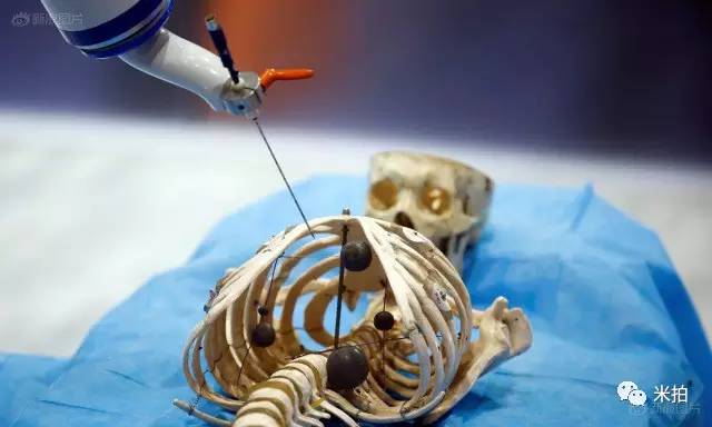 2016年10月21日,在北京举办的“2016世界机器人大会”上,一个机器人在人类骨骼模型上模拟使用医疗器械。