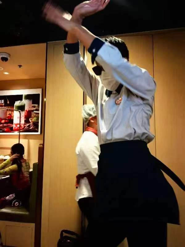 到了表演后的“艺术家访谈”环节,小哥说,在差不多一周前,店里的“科目三”任务就安排上了,练习接近两天之后,店里三个学会的小哥就开始了营业。