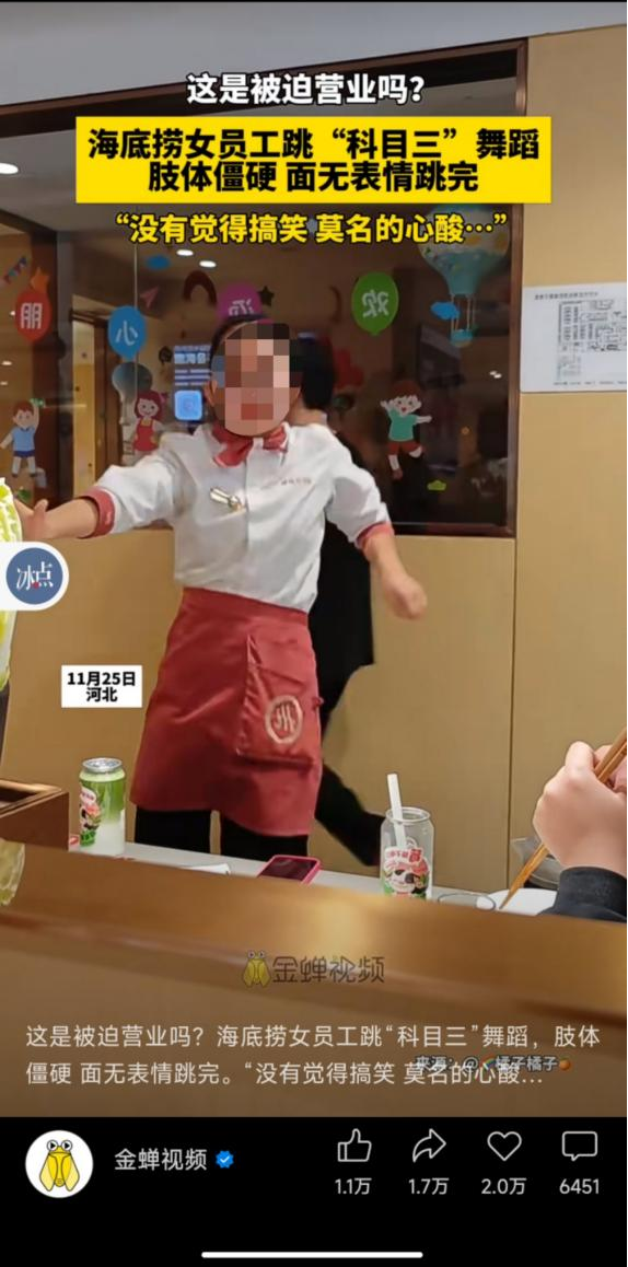 第二个来源,则可能是跳海底捞的员工。即便小哥与店长没正面告知老壶,但在另外一个视频里,有的员工跳科目三的时候,被形容为“肢体僵硬”、“面无表情”,为生活所迫的痕迹不要太明显。