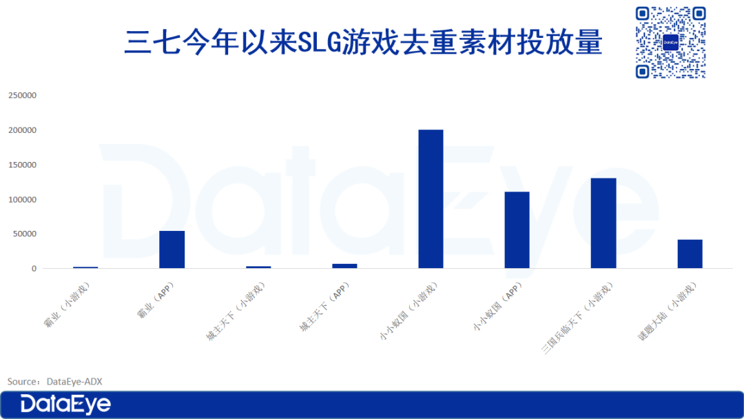 2、《小小蚁国》之后,目前还没有等量级的买量“大户”。根据DataEyeADX显示,三七几款SLG买量投放的去重素材量,除了《三国兵临天下》小游戏外,都与《小小蚁国》不是一个级别。如果算上去年的数据,《小小蚁国》的量级会远超其它。