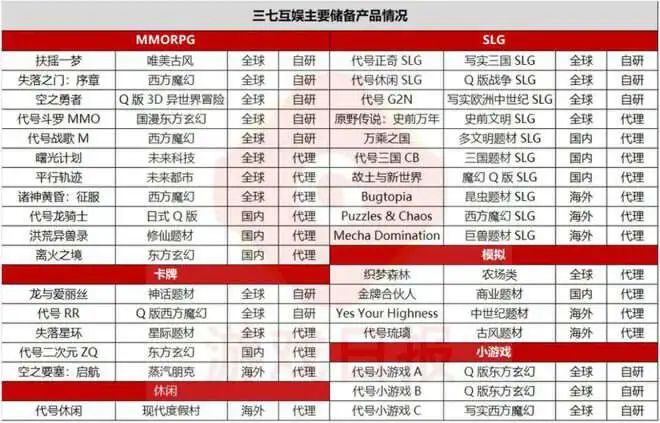 再看看主要储备产品,根据游戏日报的统计,三七储备的SLG题材多元、面向的市场也较为多元,但主要是全球或海外市场。其中自研产品三款则颇为神秘,全是面向全球。