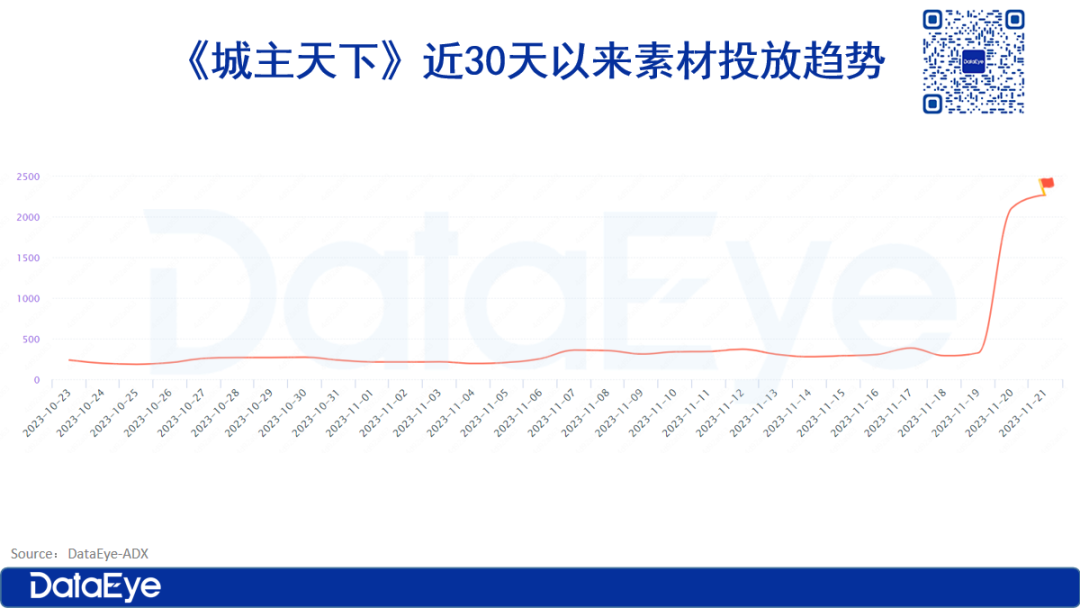DataEye-ADX数据显示,《城主天下》APP在今年6月开始投放,整体预热阶段投放量不高,在未上线前日均投放保持在200-300组左右。公测前一天《城主天下》加大素材投放,素材量达2110组,公测当天投放量大幅度飙升,达到2531组。