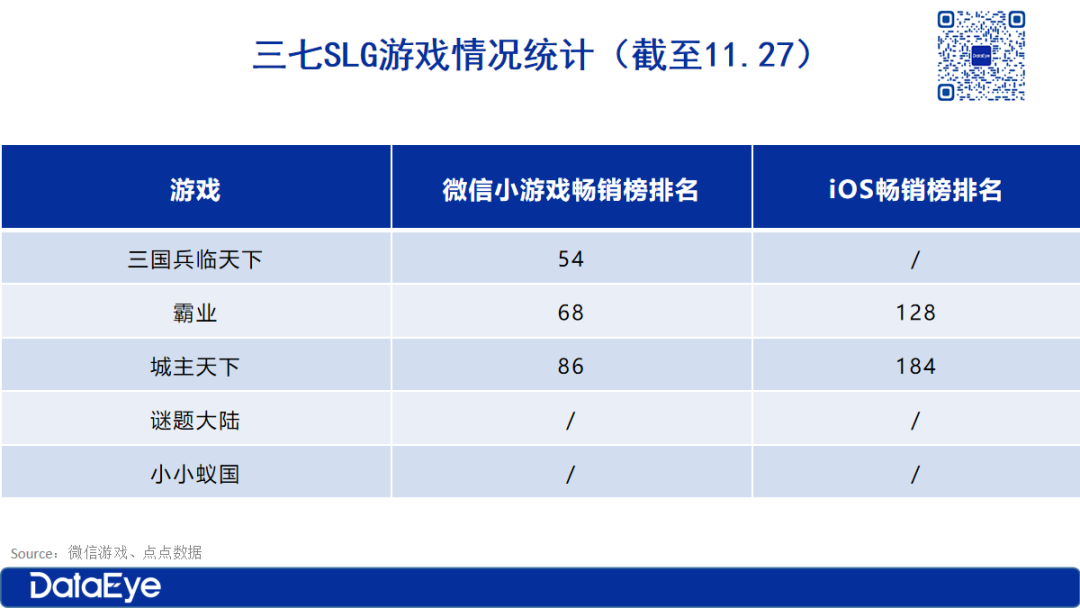 DataEye研究院统计了11月27号 iOS畅销榜200内,以及微信小游戏畅销榜99内的三七系SLG。如下表: