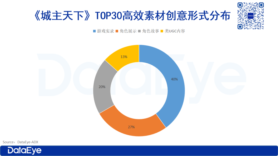 根据ADX数据,《城主天下》买量素材计划数TOP30(下称“高效素材”)创意类型如下。