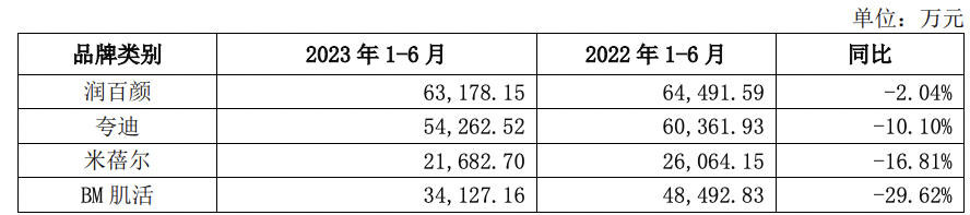 2018年-2022年,功能护肤品业务高速发展,成为华熙生物的增长大盘。进入2023年,华熙生物的护肤业务增长乏力,其主力品牌润百颜、夸迪等,都出现不同程度的营收下滑。