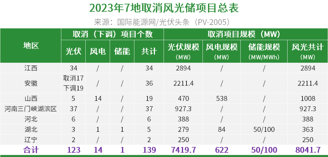 国际能源网/光伏头条(PV-2005)梳理后发现,江西、安徽、湖北、河南三门峡湖滨区、辽宁、山西、河北7地清理了风光储项目,共拟取消139个风光储项目,风光规模共计8041.7MW,储能规模50MW/100MWh。
