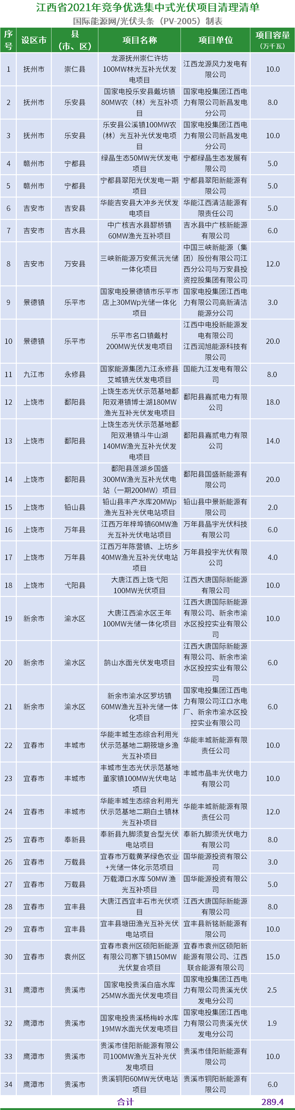 10月25日,江西省能源局印发《关于开展逾期光伏项目清理工作的通知》,34个光伏项目因未开工被取消建设指标,总计约2.894GW。