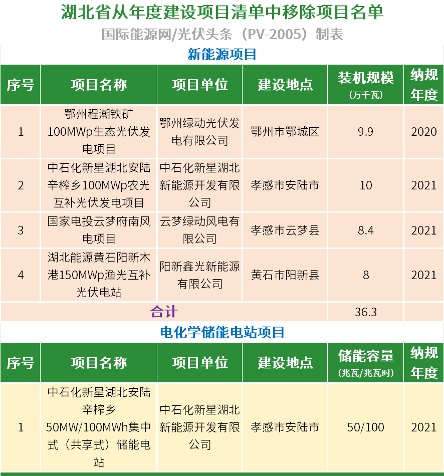 国际能源网/光伏头条(PV-2005)发现,被移除的项目共有5个。其中,光伏项目279MW、风电项目84MW、储能项目50兆瓦/100兆瓦时。