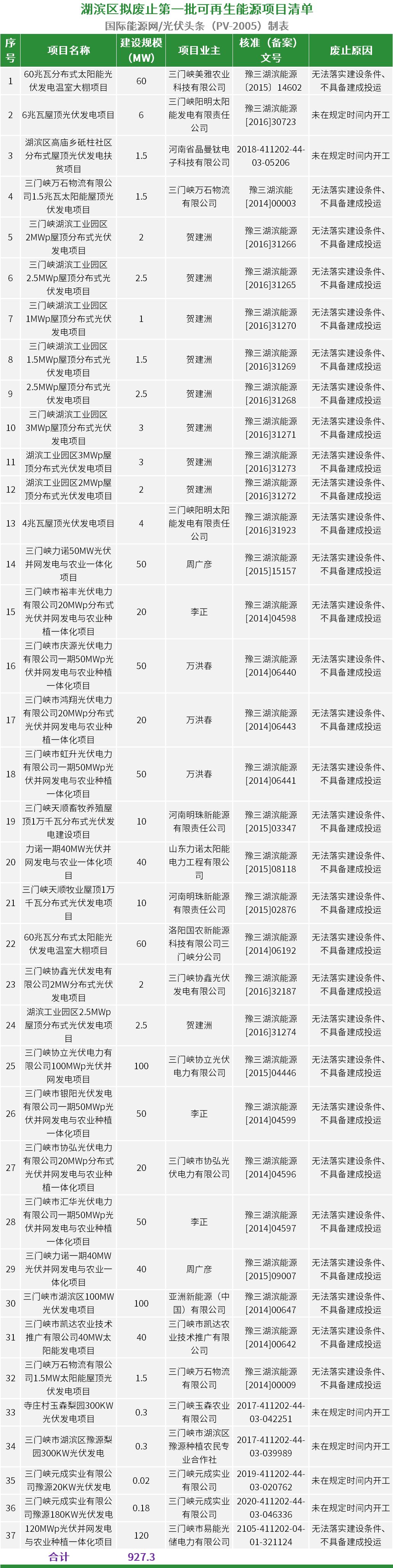 8月31日,河南省三门峡市湖滨区发改委公示了第一批拟废止的可再生能源项目清单,共包含37个光伏项目,合计项目规模927.3MW。其中,集中式光伏项目690MW、分布式光伏项目237.3MW。
