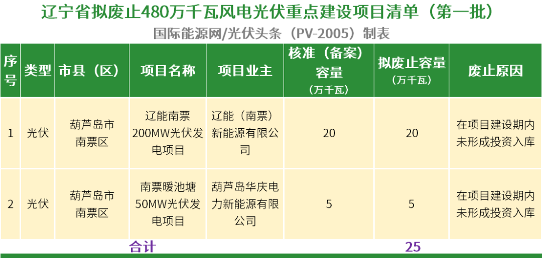 根据公告,辽宁省480万千瓦风电光伏重点建设项目中存在“核而不建”“建设滞后”等问题的风电光伏项目进行了梳理,拟废止未按期建成并网的辽能南票200MW光伏发电项目、南票暖池塘50MW光伏发电项目等2个光伏发电项目共计25万千瓦未并网规模指标。