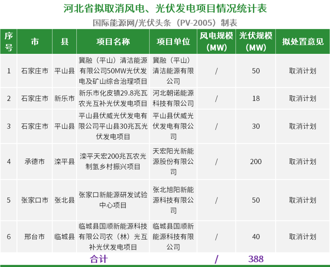国际能源网/光伏头条(PV-2005)通过梳理,河北省拟取消2022年的光伏项目6个,规模总计388MW。