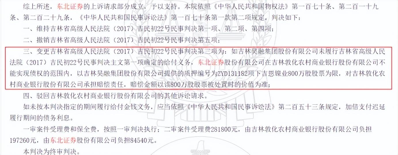 但东北证券认为,该案已获得吉林省高级人民法院以及最高人民法院的审理,判决其以案涉800万股吉恩镍业股票被处置时价格为限承担补充赔偿责任,且该诉讼案件已经终结。对此,东北证券表示将提起诉讼。