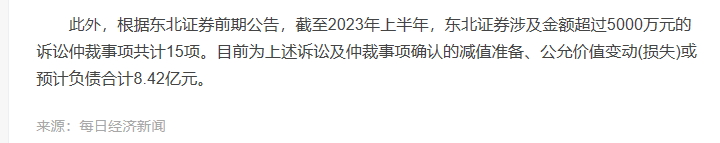 《每日经济新闻》援引东北证券前期公告称,截至今年上半年,东北证券涉及金额超过5000万元的诉讼仲裁事项共计15项,为上述诉讼及仲裁事项确认的减值准备、公允价值变动(损失)或预计负债合计8.42亿元。