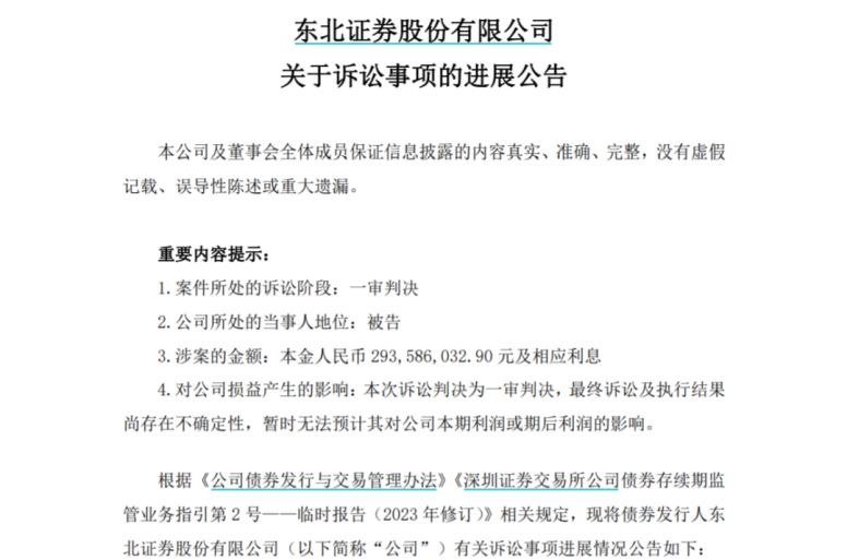 2023年前三季度,东北证券净利润为5.76亿元,一旦判决生效,涉及的本金占公司前三季度净利润的5成。