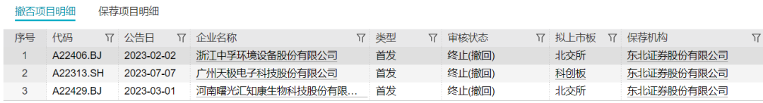 同时,今年东北证券担任保荐券商的公司中,被终止或撤回的有3家,其中在北交所有2家被终止或撤回的项目,分别为浙江中孚环境设备股份有限公司、河南曙光汇知康生物科技股份有限公司,在科创板IPO项目被终止或撤回的公司,名称为广州天级电子科技股份有限公司。