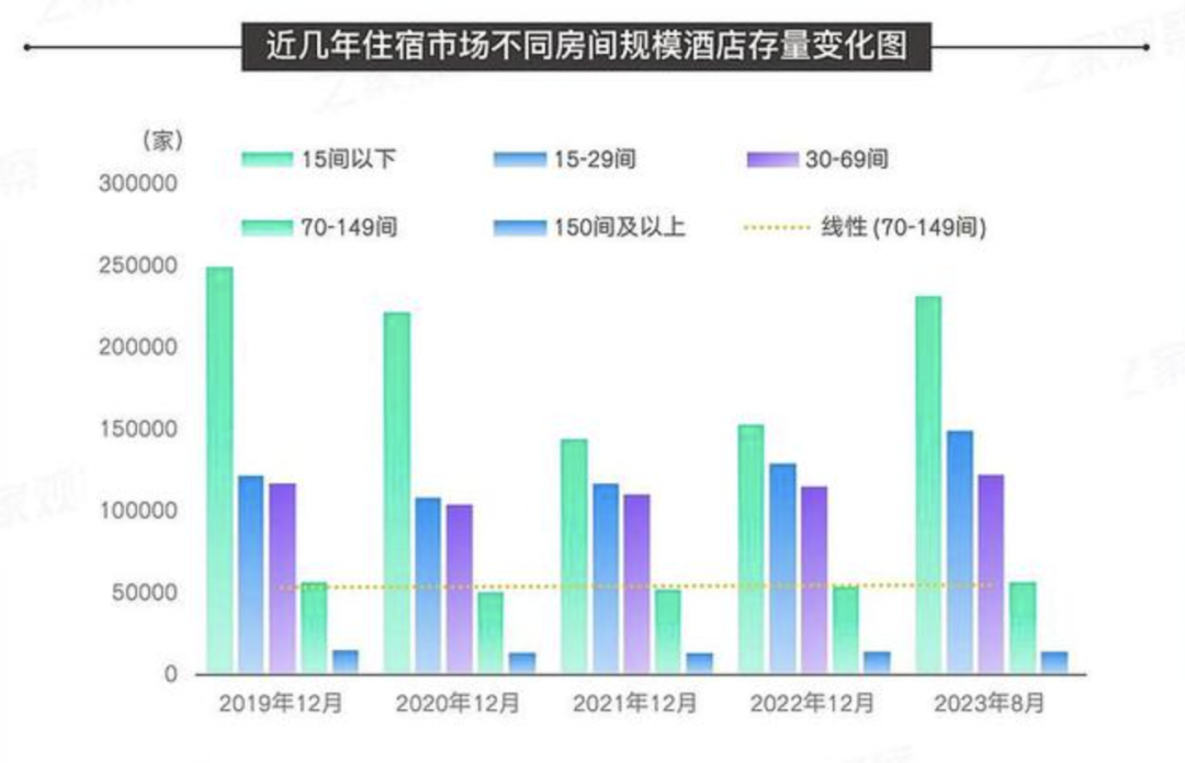 从报告中我们不难看出,以15间客房规模为代表的住宿设施虽然在2020年经历存量锐减,但供给恢复速度较快,而70-149间客房规模的存量,则始终位于一个较稳定的区间。