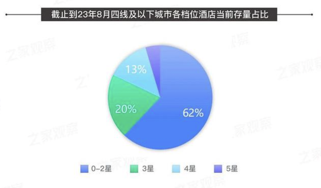 报告数据显示,截至2023年8月份,国内三线城市0-2星档位酒店的存量占整体的60%,四线城及以下城市0-2星档位酒店的存量占整体的62%。