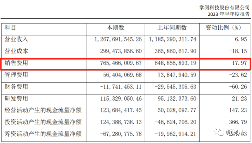 进一步看,掌阅在报告期内的销售费用是7.65亿,同比去年的6.89亿,增加17.97%。