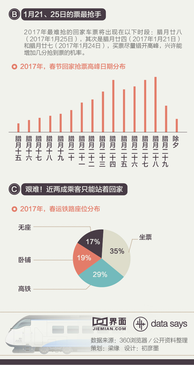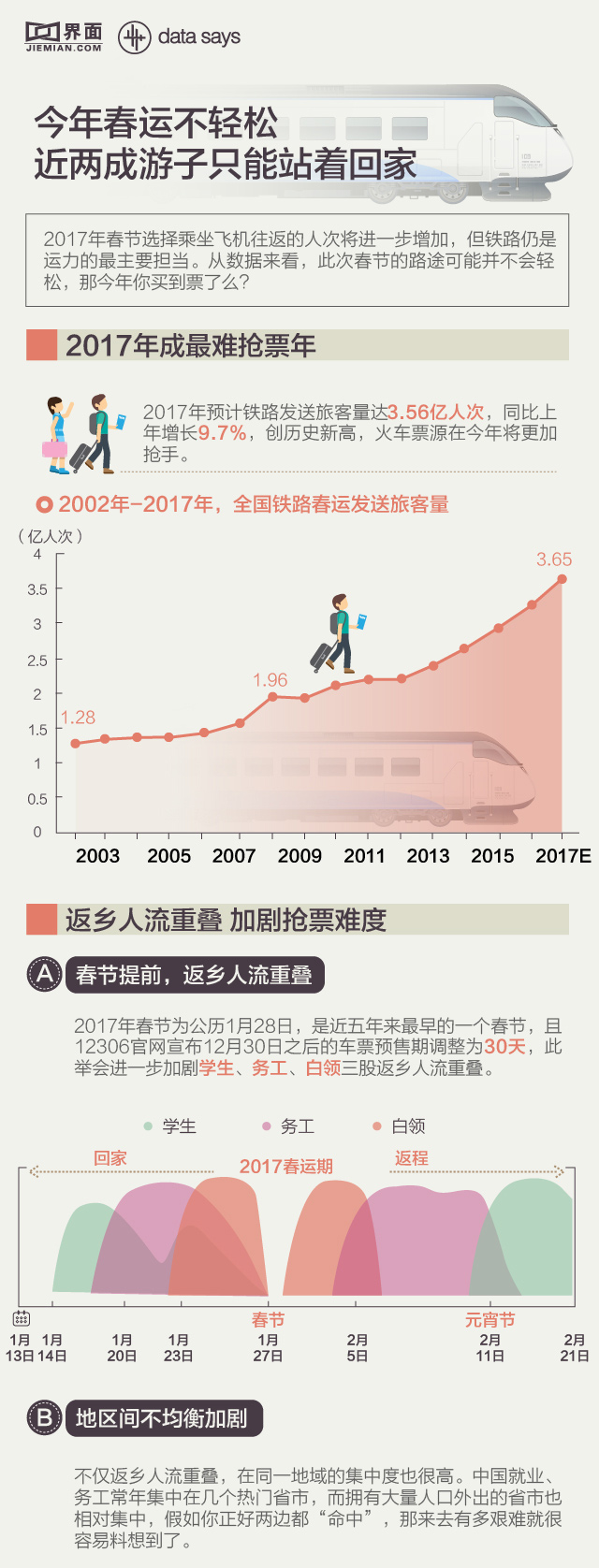 2017年春节选择乘坐飞机往返的人次将进一步增加,但铁路仍是运力的最主要担当。从数据来看,此次春节的路途可能并不会轻松,那今年你买到票了么?