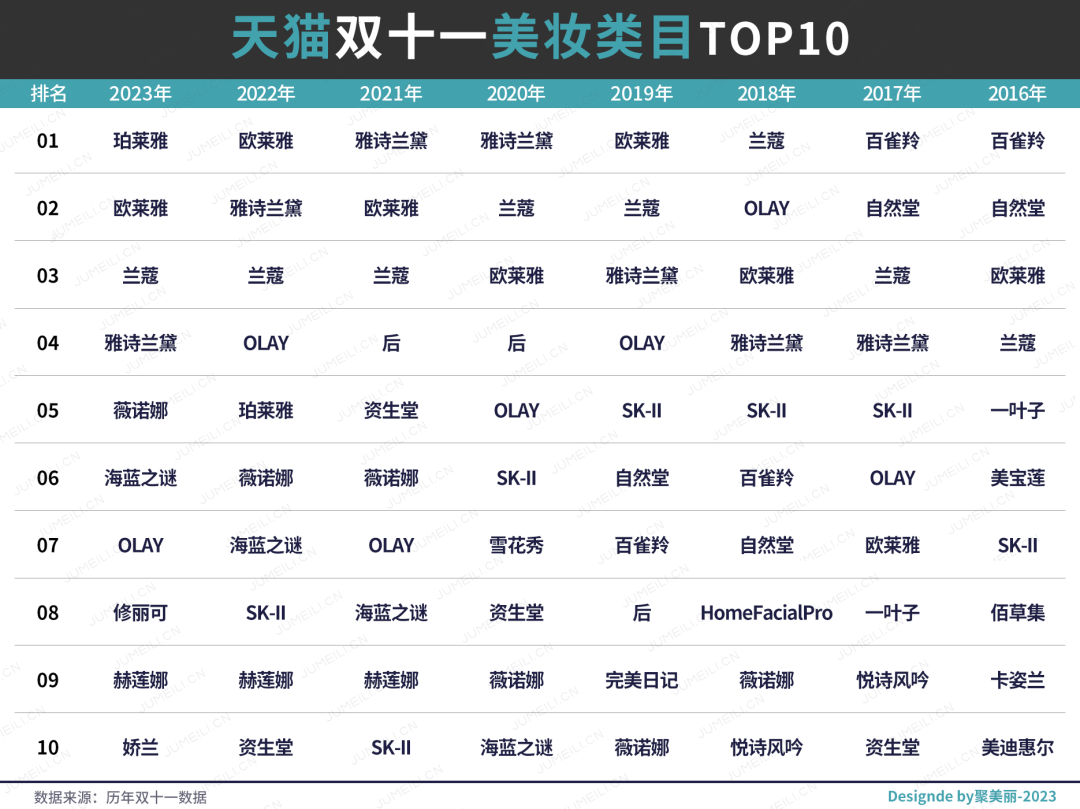 对比2017-2023年双11天猫美妆TOP10榜单来看,自2022年起韩妆已经连续两年跌出榜单前十。