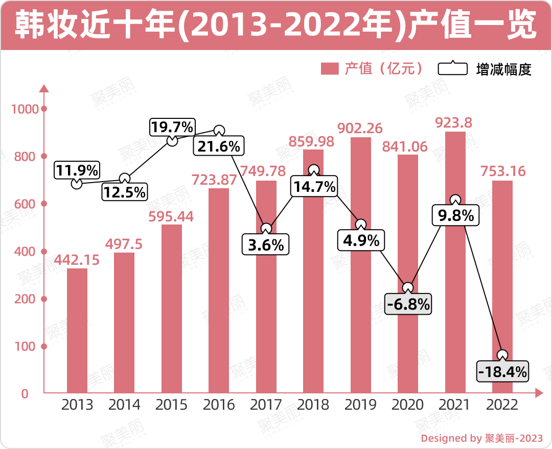 从近十年的年产值来看,2022年韩妆年产值已经跌至753.16亿元。