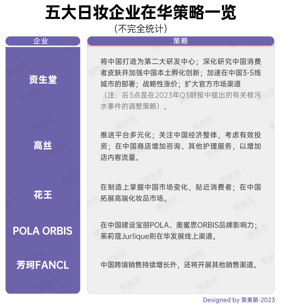 面对在华的一系列困境,一向以“守”为策略的日系美妆企业也开始有了转变,聚美丽梳理其在中国市场的发展策略发现,以资生堂等为代表的日妆集团已经开始由“防御”转为“进攻”。