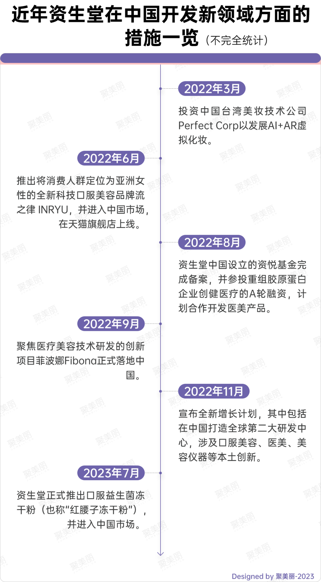 在新领域开发方面,资生堂提出将中国打造为第二大研发中心的策略,并重视在华的本土创新,目前在医美、美容仪器、大健康、口服美容等领域都有相关投资或是合作。