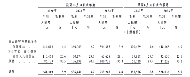 2020年至2023年上半年,梦金园毛利率分别为5.9%、3.2%、4.8%、5.7%。导致梦金园毛利率长期偏低的原因主要在于产品结构。