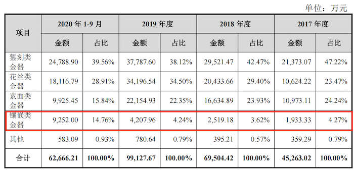 界面新闻记者注意到,同样为镶嵌类产品,老铺黄金两次招股书披露收入却有极大差距。根据深市主板受理的招股书,2017年至2019年老铺黄金镶嵌类金器的收入分别为1933.33万元、2519.18万元、4207.96万元,占当期主营业务的比例均不到5%。