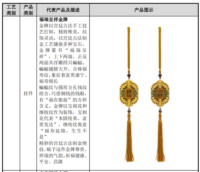 对比两版招股书,A股版招股书镶嵌类金器嵌有宝石,代表产品包括玫瑰花窗宝福、富贵绵长宝莲宝盒、鸳鸯和合摆件、富瑞呈祥金牌。