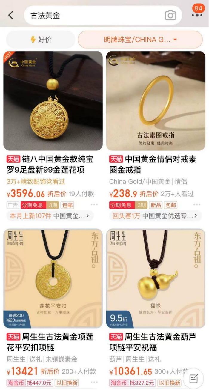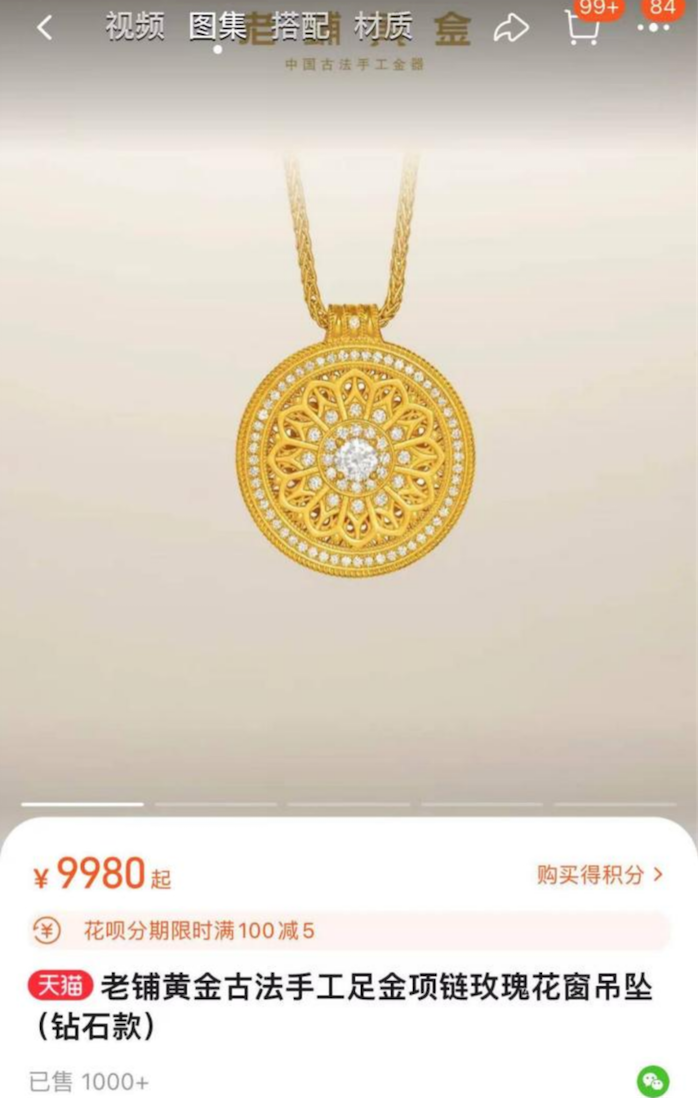 淘宝老铺黄金官方旗舰店显示,店铺内销量最好的古法手工足金耳饰养耳针一对克重约1.1g的价格为850元,镶嵌款玫瑰花窗吊坠7.3g(重量不含钻石)的单价为9980元,克重为1367.1元。