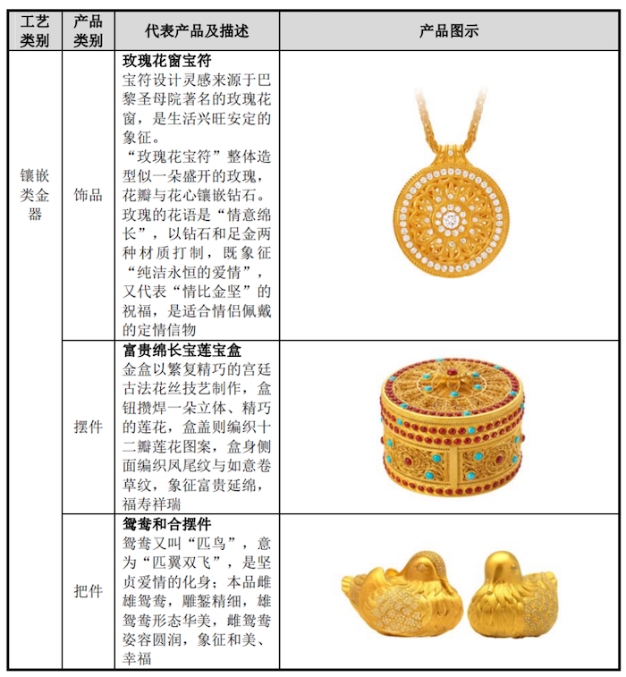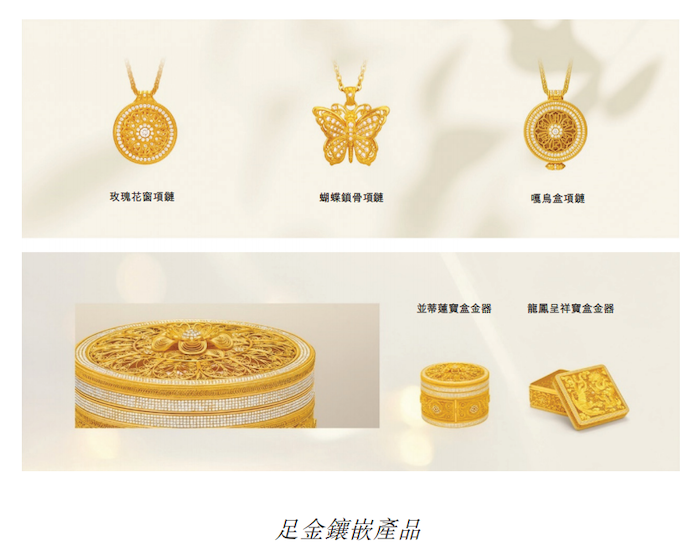 在本次递交的招股书中,足金镶嵌产品描述为足金镶嵌钻石或其他宝石,代表产品有玫瑰花窗项链、蝴蝶锁骨项链及并蒂莲宝盒金器等,且区别于高纯金制成的足金黄金产品,与“镶嵌类金器”描述无明显不同。足金黄金产品的描述则为“设计包括吊坠、手镯、戒指、耳钉等配饰,以及装饰品及器皿等克重较大的珠宝,如花丝平安扣、如意祥云纹手镯、独角貔貅实符等”。