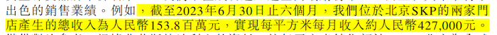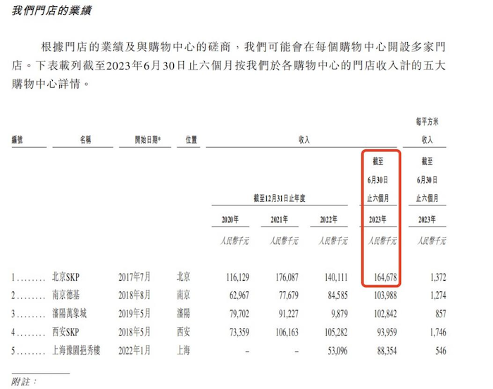 但根据招股书另一处披露,老铺黄金按照购物中心门店收入计算的前五大购物中心收入中,截至2023年6月30日止六个月北京SKP收入为1.6亿元,两处披露存在差异。