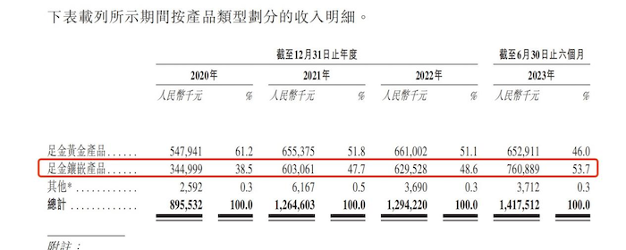 此次披露招股书则将主营业务收入划分为足金黄金产品、足金镶嵌产品及其他(宝石制成的非黄金产品及保养维修服务收入)。