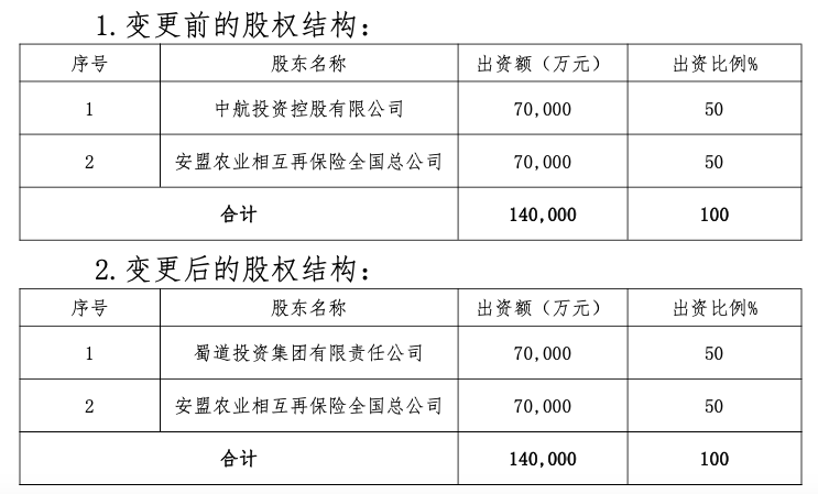 此次转让成功后,中航安盟保险的股东将变成安盟农业相互再保险全国总公司和蜀道集团,二者分别持股50%。