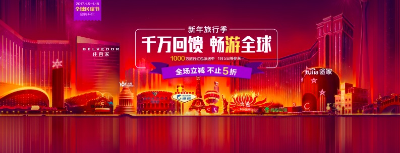 “2017全球民宿节”火热来袭!2016年12月29日,由共享经济海外非标住宿的领导者住百家和国内领先的公寓民宿预订平台途家共同发起,联合携程民宿、去哪儿民宿、蚂蚁短租、大鱼、木鸟短租、欢墅、斯维登等平台打造的公寓民宿预订优惠活动预热上线。