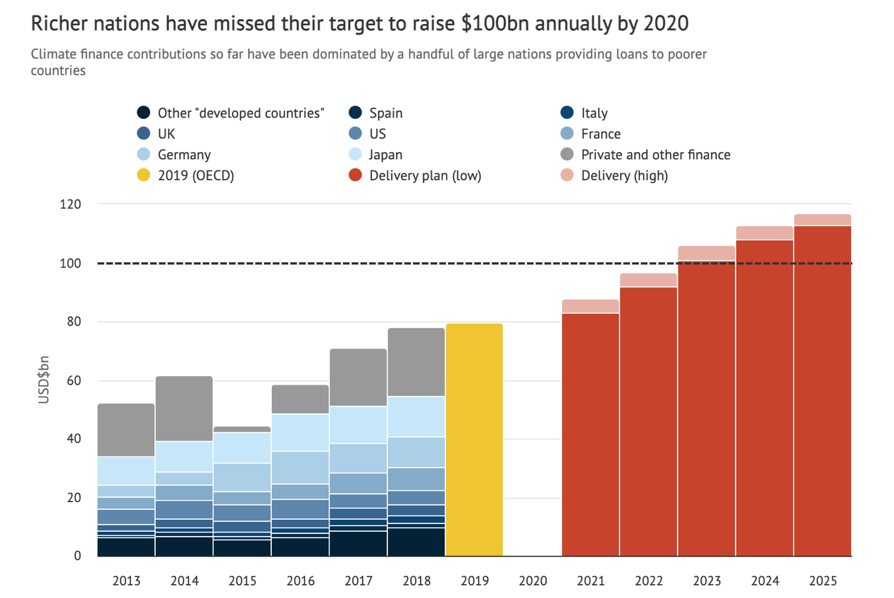 目前,只有那些1992年联合国气候公约达成时被定为“发达国家”的国家有义务提供气候融资。然而,由于这些发达国家存在违背承诺的先例,使得发展中国家和小岛屿国家产生了疑虑。这些发达国家曾在2009年承诺从2020年起每年向较贫穷国家提供1000亿美元的气候融资。