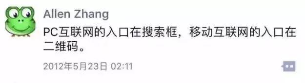 2012年张小龙说「PC互联网的入口在搜索框,移动互联网的入口在二维码」。