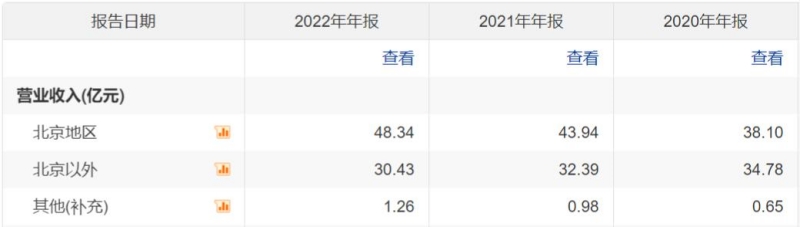 但是,作为北京本地乳制品企业,三元股份已经在北京发展了几十年。最近的2020年至2022年各年度,三元股份来源于北京地区的营业收入分别为38.10亿元、43.94亿元和48.34亿元,呈逐年增长的趋势;然而,同期来源于北京以外的营业收入从34.78亿元逐年下滑至30.43亿元。
