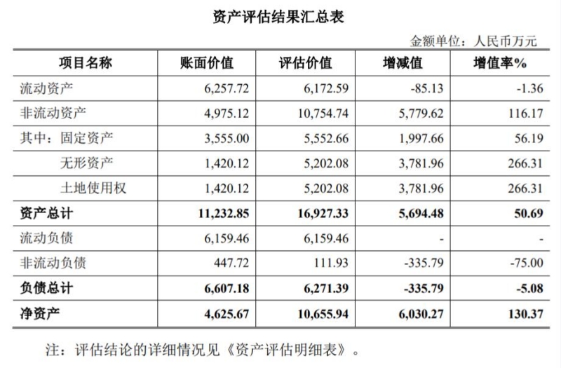 经过多年托管,三元股份收购山东三元的时候,以2022年12月31日为评估基准日,山东三元经审计的账面净资产为4625.67万元,采用资产基础法,股东全部权益本次评估价值为10655.94万元,评估增值6030.27万元,增值率为130.37%。