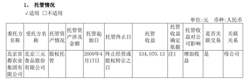 根据三元股份与首农食品集团的协议约定,在托管期间,山东三元的经营收益和亏损仍由首农食品集团按照持股比例享有和承担;如果山东三元盈利,首农食品集团向三元股份支付当年托管收益,金额为首农食品集团按持股比例享有的山东三元当年净利润的15%;如果山东三元在某一会计年度发生亏损,首农食品集团不再支付当年的托管收益。