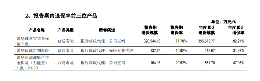 前三年季度偿付能力报告显示,国华人寿退保金额前三位的产品销售渠道均包括银行邮政代理,这三款产品分别为国华鑫意宝年金保险A款、国华优选定期寿险、国华附加鑫账户年金保险(万能型)A款(2017),年度累计退保率分别为82.21%、31.37%和47.05%。