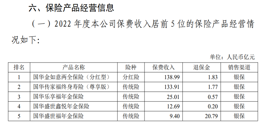 2022年,国华人寿保费收入居前5位的保险产品销售渠道均为银保渠道,仅这5位的保险产品已占据全年保费的84.61%。
